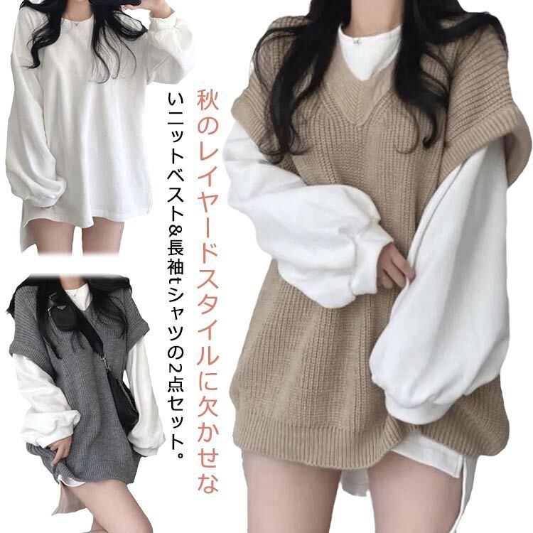 秋のレイヤードスタイルに欠かせないニットベスト\u0026長袖tシャツの2点セット。