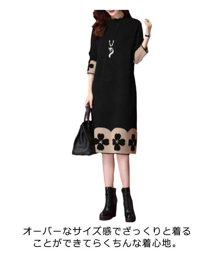 着回し力のあるワンポイントの花柄がアクセントの長袖ニットワンピース。