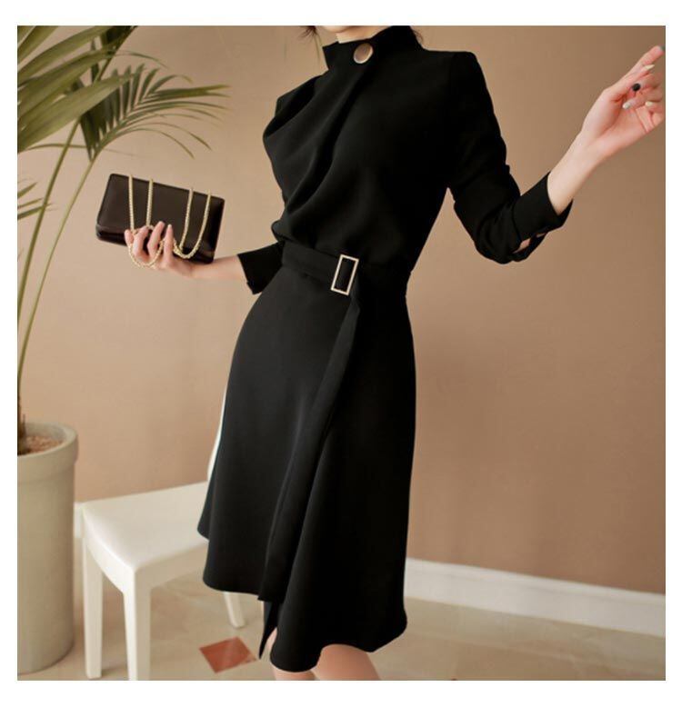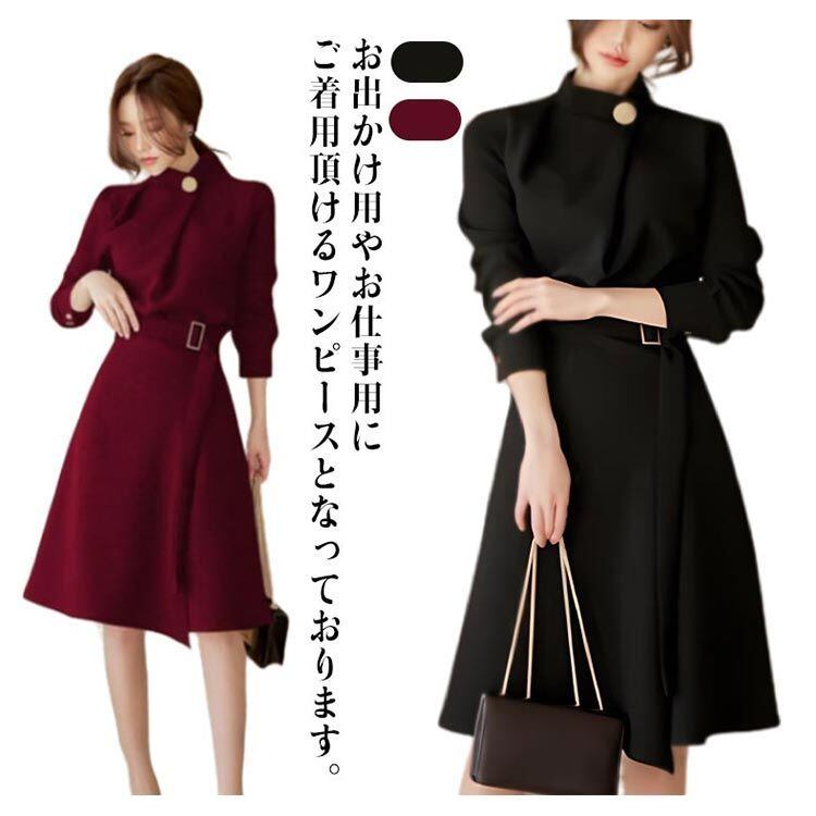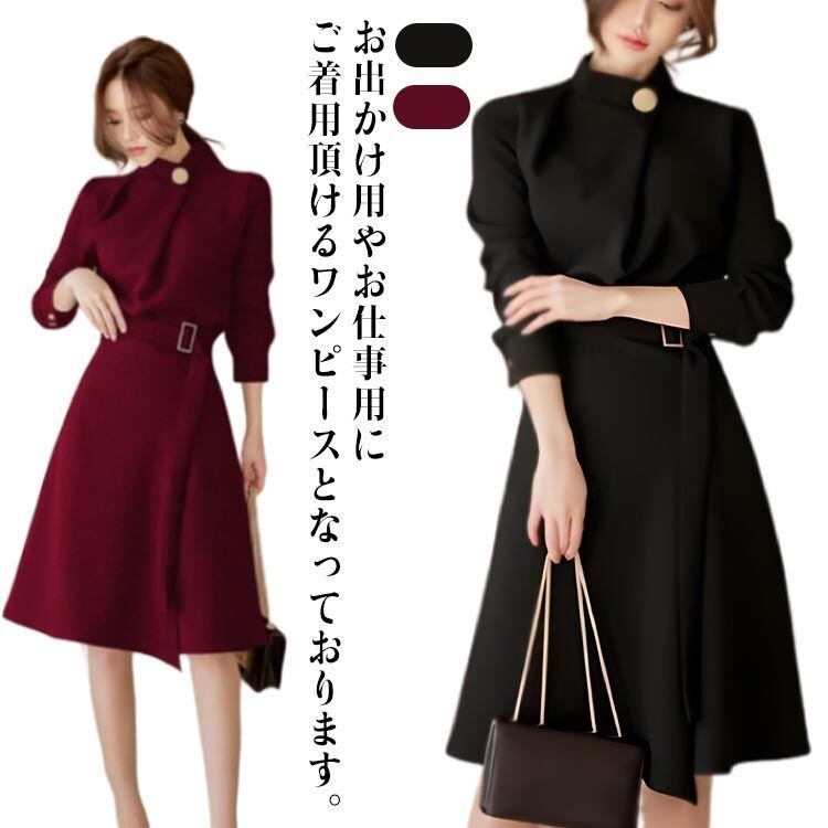 入学式 大人 ウェストベルト エレガント フォーマルワンピース 上品 高見え ママスーツ きれいめ 20代 ワンピ 大きいサイズ ハイネック 着?せ 体型カバー 長袖 パーティードレス ミモレ丈 セ#cjfj142715 | オキナ商店