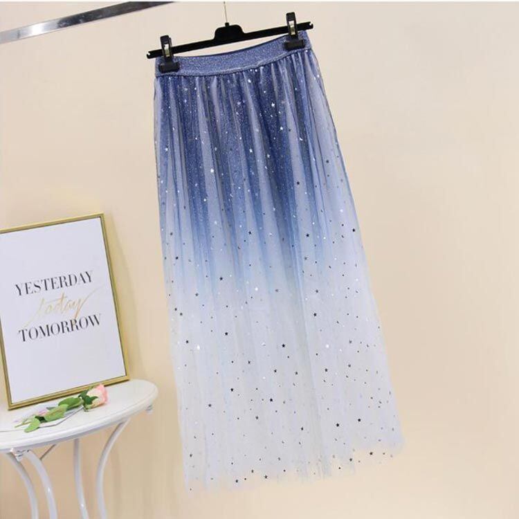 チュールロングスカート 大人 スカート 星柄 チュールスカート 星空 スカート 星 レディース フレア チュールス カート ボトムス ミモレ丈 グラデーションスカート グラデーション体型カバー フレア#wunib2222 | オキナ商店