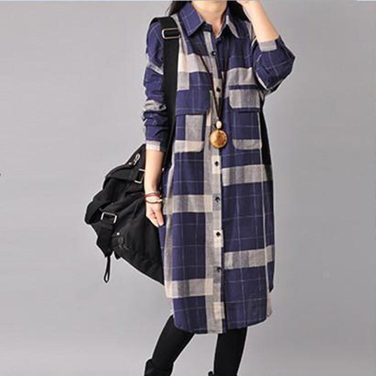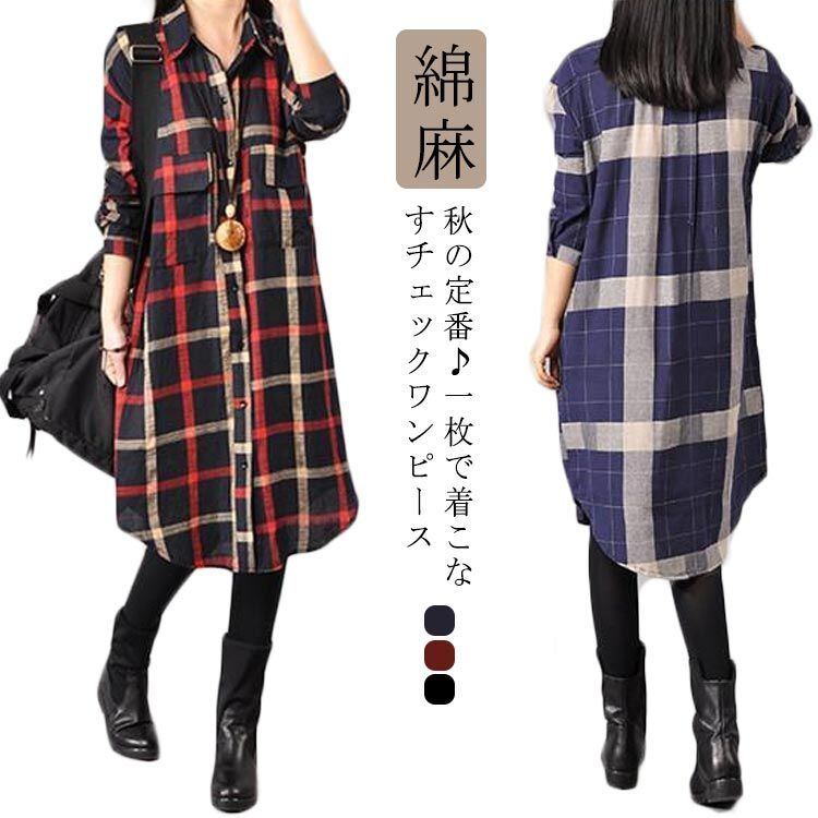膝丈 トップス レディース チェック シャツワンピース チュニック 長袖 大きいサイズ 綿 麻 カジュアル Aライン チェック柄 ロング丈 ワンピース ゆったり 体型カバー 春#yskma603234 | オキナ商店