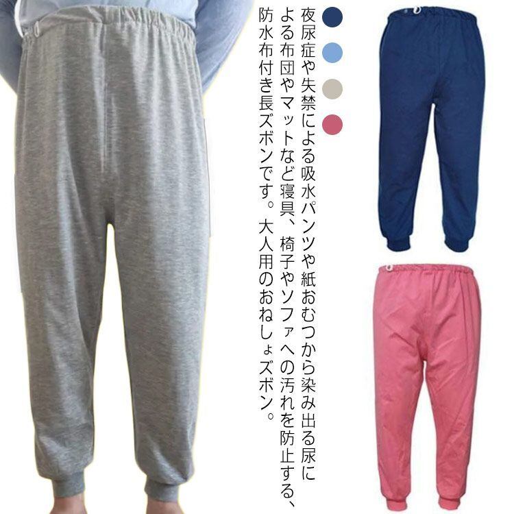 夜尿症や失禁による吸水パンツや紙おむつから染み出る尿による布団やマットなど寝具、椅子やソファへの汚れを防止する、防水布付き長ズボンです。大人用のおねしょズボン。