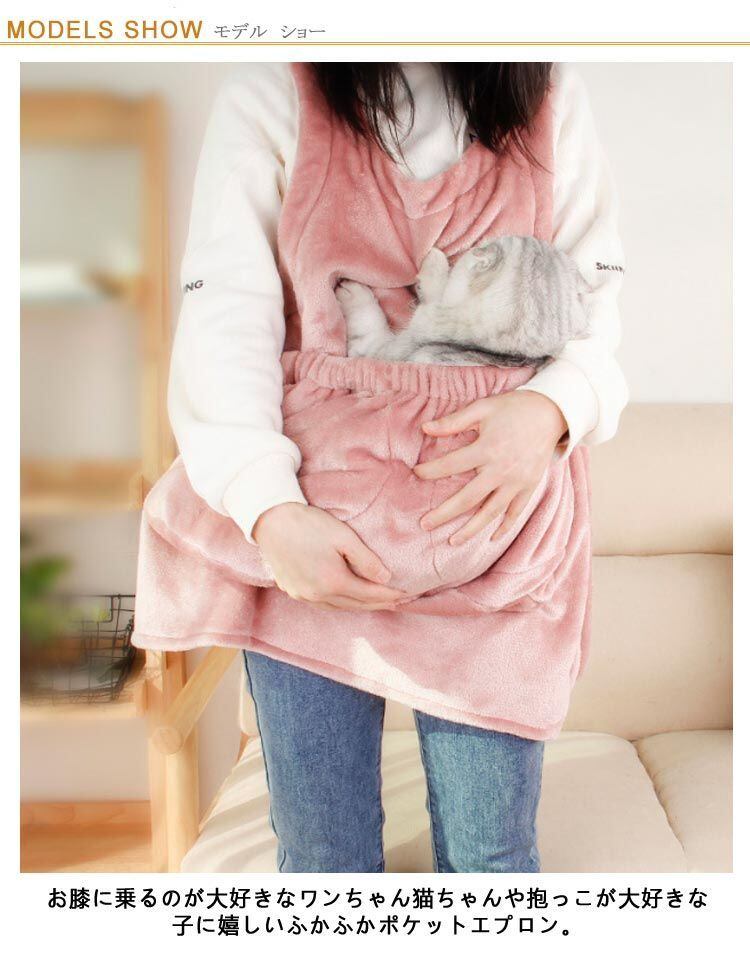お膝に乗るのが大好きなワンちゃん猫ちゃんや抱っこが大好きな子に嬉しいふかふかポケットエプロン。ペットと幸せなひと時を過ごせるエプロンです。