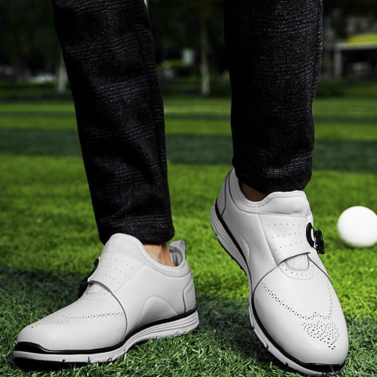 紐結び手間を省き、優しくフィットするダイヤル式ゴルフシューズ。