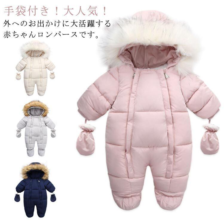 手袋付き ジャンプスーツ 赤ちゃん ベビー ロンパース 新生児 パーカー フード付き 裏起毛 フェイクファー つなぎ 雪遊び 防水 キッズ 80 女の子 防寒 暖かい 新生児 スノーウェア 足カバー #healt580757 | オキナ商店