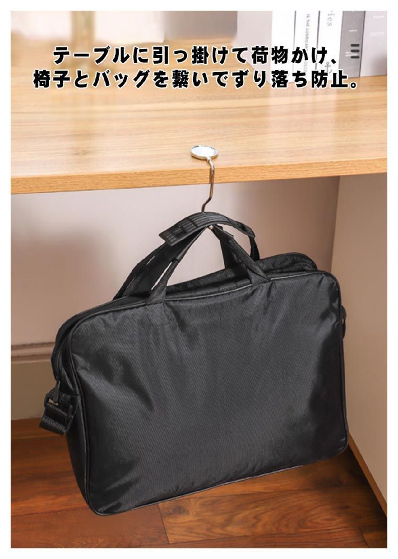 テーブルに引っ掛けて荷物かけ、椅子とバッグを繋いでずり落ち防止。