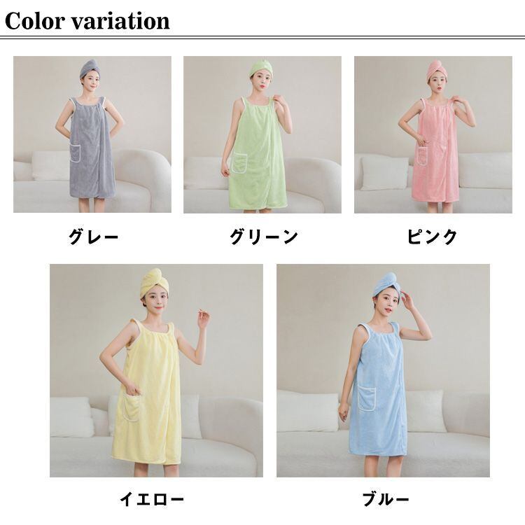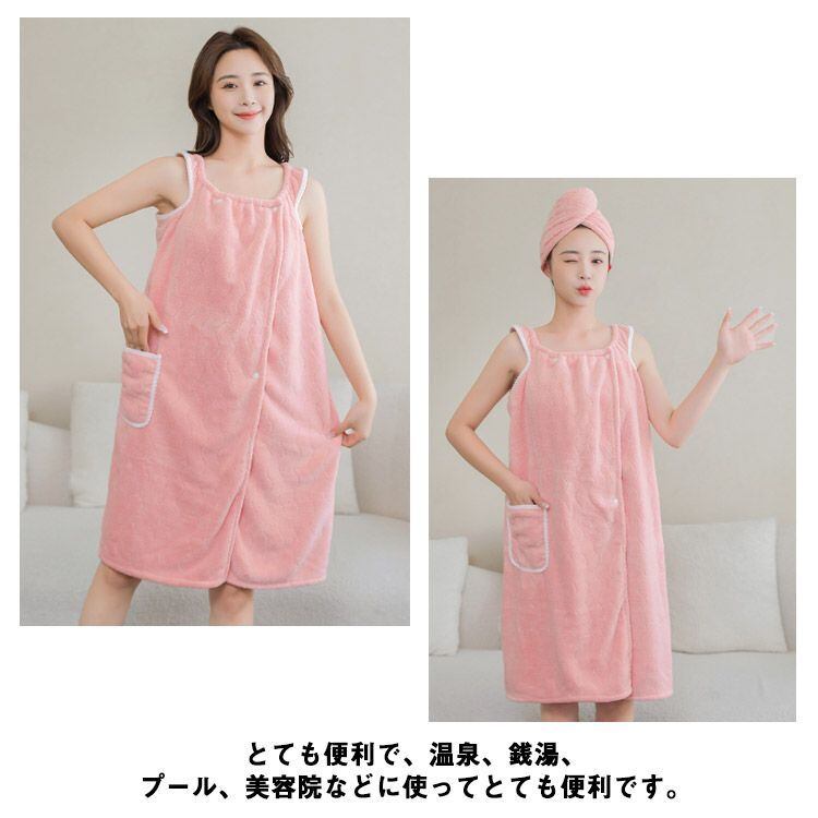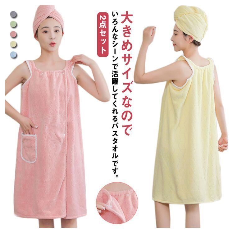 2点セット 着るバスタオル ヘアキャップ付き 大きいサイズ バスタオル ラップタオル 巻きタオル バスローブ ポケット付き レディース 吸水 大判 薄手 軽量 マイクロファイバー 海 プール ジム 水#swx3216 | オキナ商店