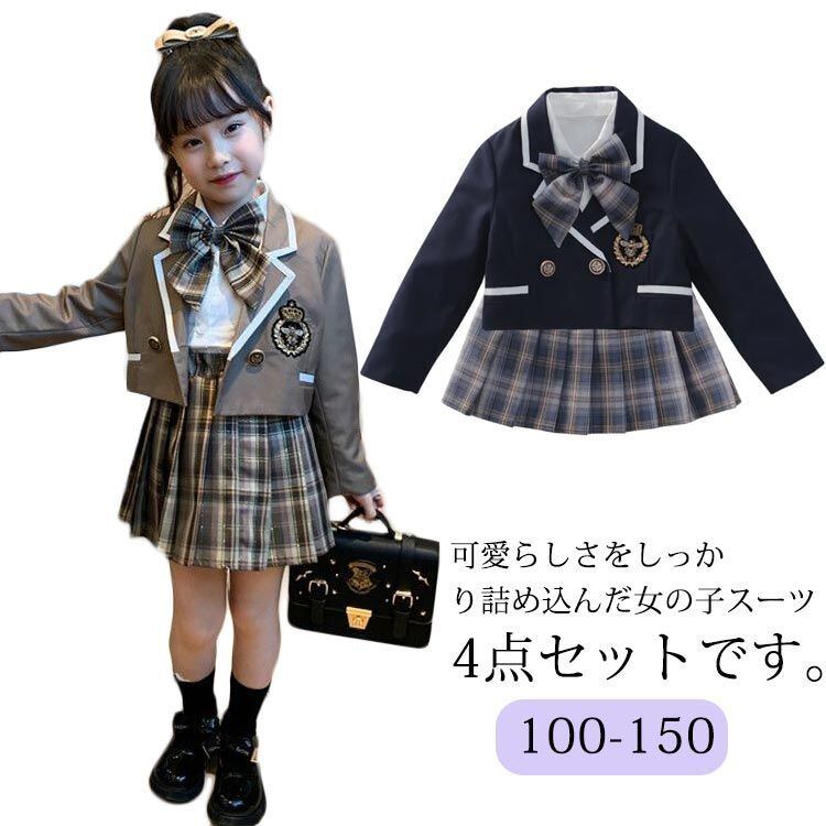 制服 入学式 ジュニアスーツ キッズ 110 女の子 4点セット フォーマルスーツ スカートスーツ 女の子スーツ スーツ 可愛い 小学校 リボン付 プリーツスカート 学校制服 ジャケット 学生服 卒業#welle579479 | オキナ商店