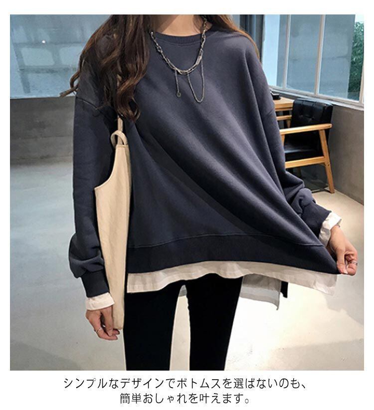 Tシャツ レディース 長袖 スウェット Tシャツ クルーネック フェイクレイヤード 重ね着風 ロンT カットソー サイドスリット 前後差 トップス 大きいサイズ 春 秋#pdd6529 | オキナ商店