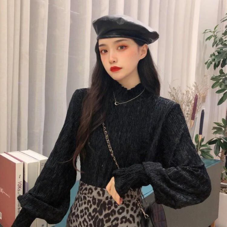 カットソー 長袖 ベロアタッチ レディース Tシャツ トップス ハイネック キャンディースリーブ レイヤード ベロアタッチ ブラック ベージュ ホワイト かわいい メロー 秋#kitsu574708 | オキナ商店
