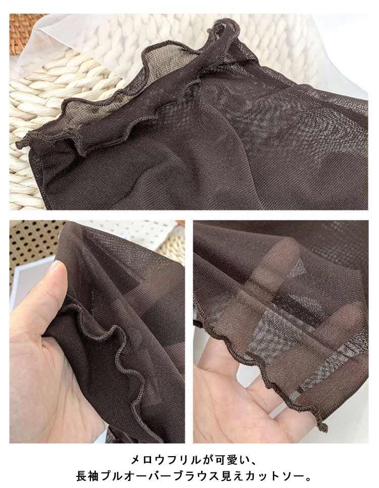 メロウフリルが可愛い、長袖プルオーバーブラウス見えカットソー。