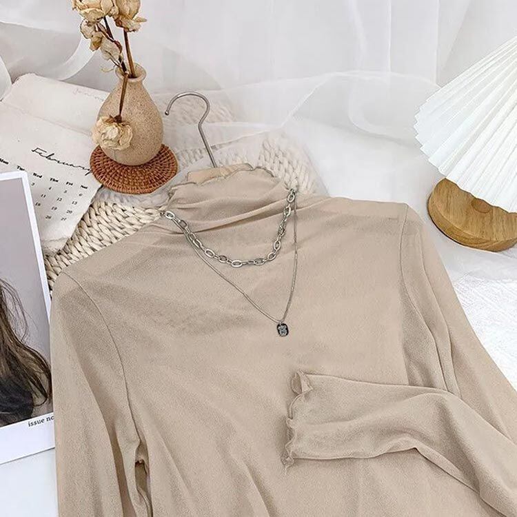 チュール シアー レイヤード メッシュトップス シアートップス ハイネック メロウ レディース シースルー コーデ インナー シアートップス 透け感 フリル トップス 長袖 伸縮性 カットソー メロー#gurug577165 | オキナ商店