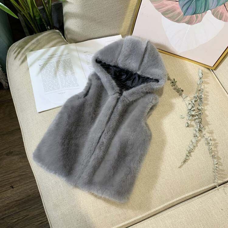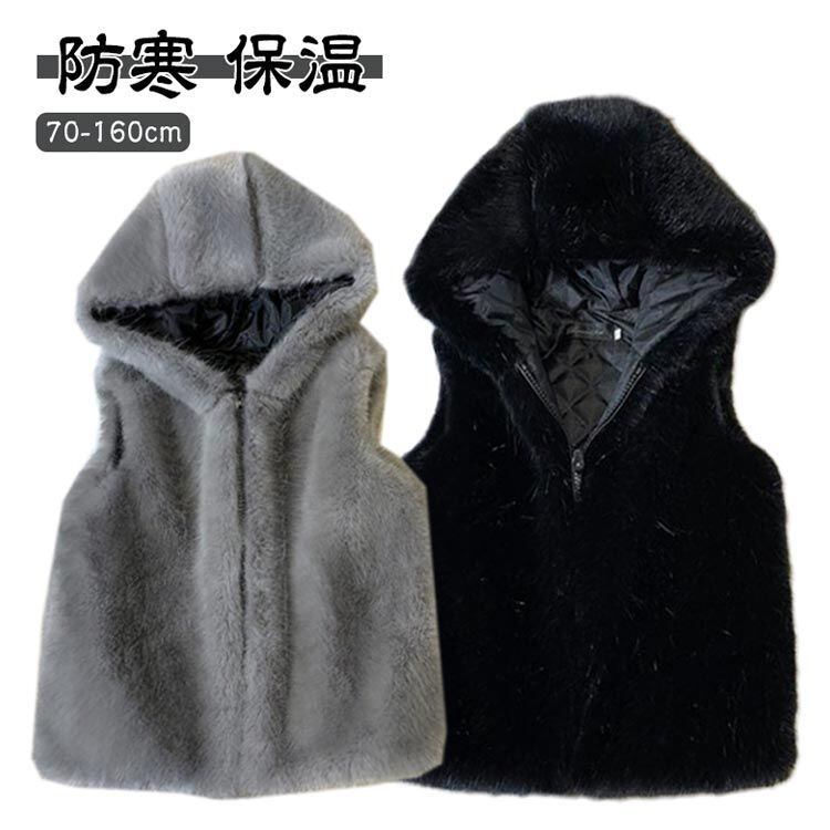 さらっと肌触りの良いフェイクファーで存在感抜群にデザインしたフードベストです。【70-160cm】