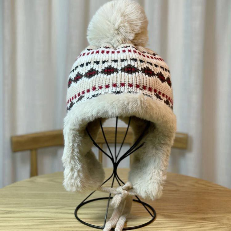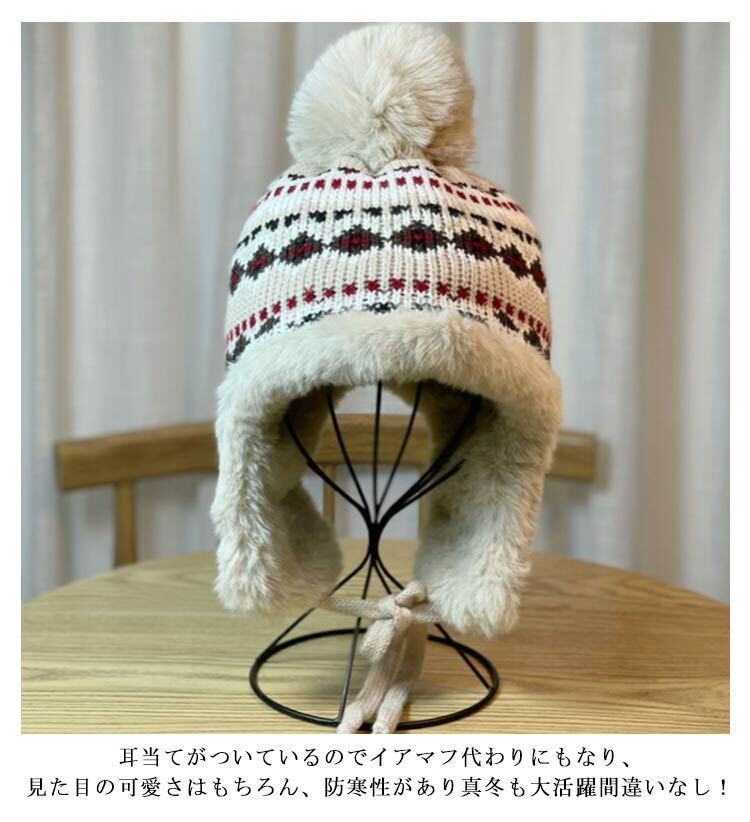 レディース あたっか 耳あて付き 秋冬 防寒 小顔効果 アウトドア 学生 雪柄 ポンポン付き 厚手 厚手 耳付き 帽子 ノルディック柄 ボアフリース ニット帽 ニットキャップ スキー スノボ スノー#cjfj140395 | オキナ商店