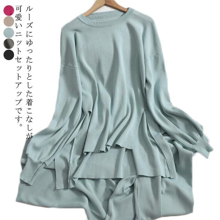 【2点セット】【トップス+パンツ】ニットアップ ニットセットアップ レディース 長袖 ランドネック スリット入り ウエストゴム セーター ロングパンツ ニット 無地 着回し 大人可愛い 可愛い かわい#wxn05711 | オキナ商店