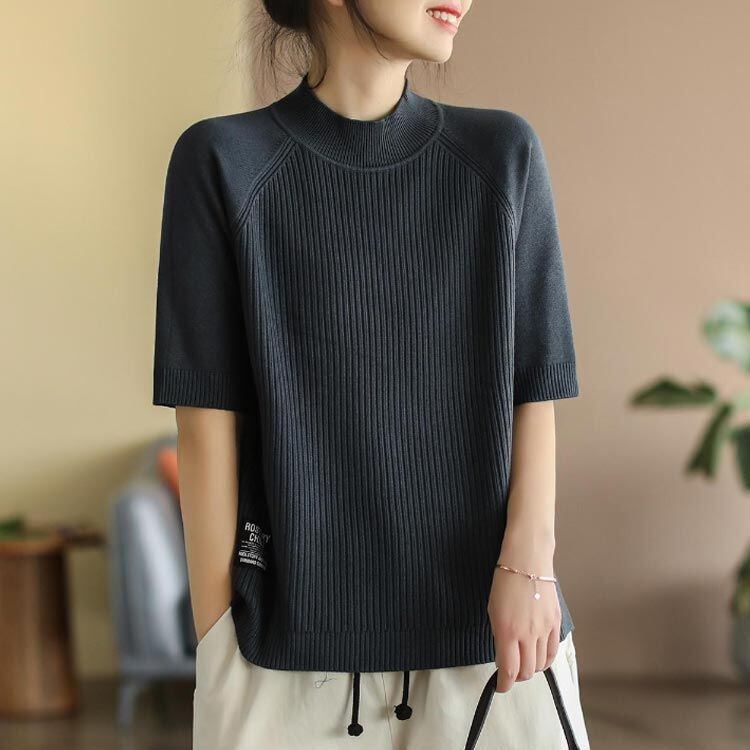 上品に着こなせるハイネックのシンプルな五分袖トップス。