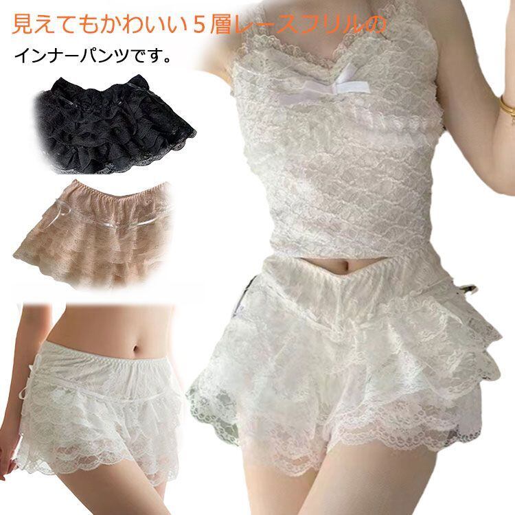 総レース インナーパンツ ショーツ スパッツ 5段 フリル ペチコート リボン 1分丈 下着 ペチパンツ ショートパンツ ドレス スカート 透け防止 レース シフォン キュロット ペチパン ホットパ#song425 | オキナ商店