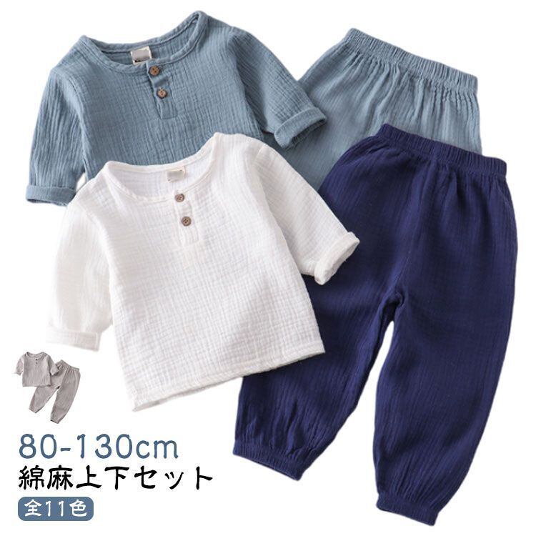 キッズ 上下セット 綿麻 半袖Tシャツ ロングパンツ ベビー 子供服 80 90 100 110 120 130cm ルームウェア 赤ちゃん 部屋着 パジャマ 女の子 男の子 無地 幼児 春夏 クルー#pop566 | オキナ商店