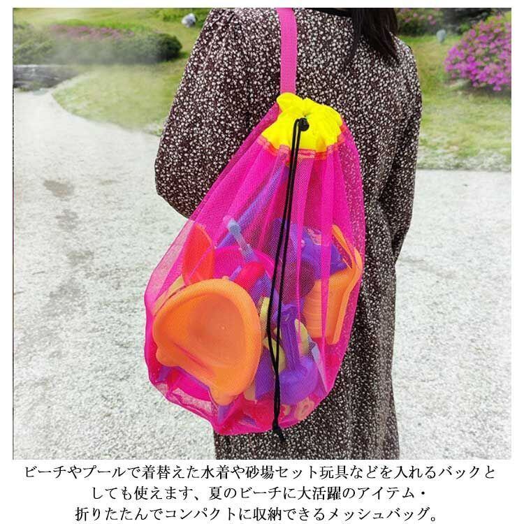 ビーチやプールで着替えた水着や砂場セット玩具などを入れるバックとしても使えます、夏のビーチに大活躍のアイテム・折りたたんでコンパクトに収納できるメッシュバッグ。