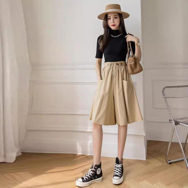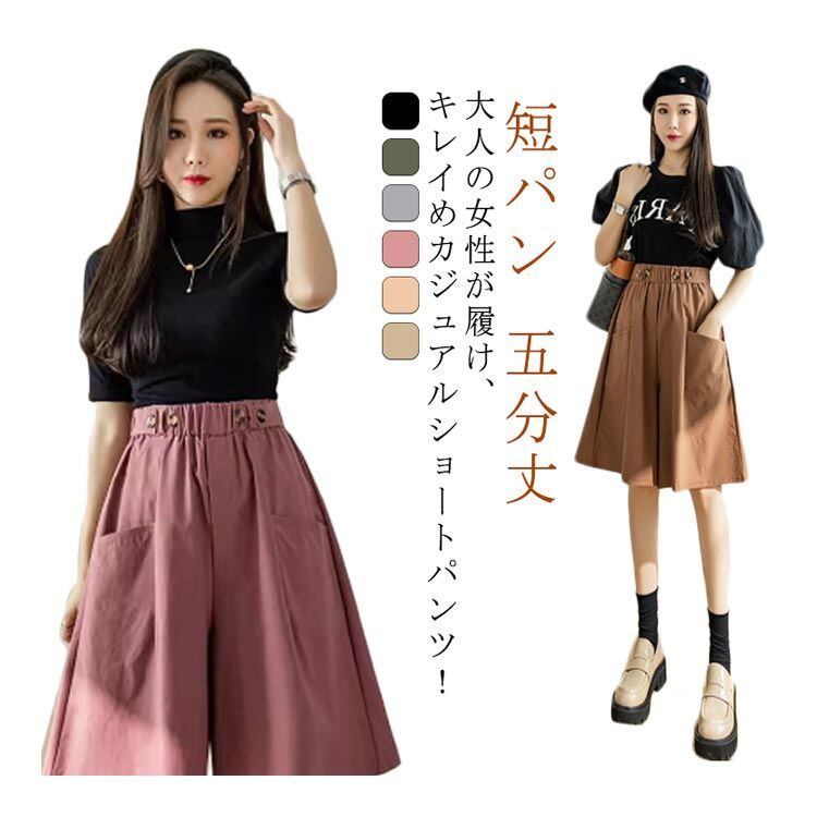 ハーフパンツ レディース スカート風 ショートパンツ 短パン 五分丈 キュロットパンツ スカーチョ ボトムス aライン ハイウエスト ウエストゴム 通勤 通学 カジュアル キレイめ#lj8422 | オキナ商店