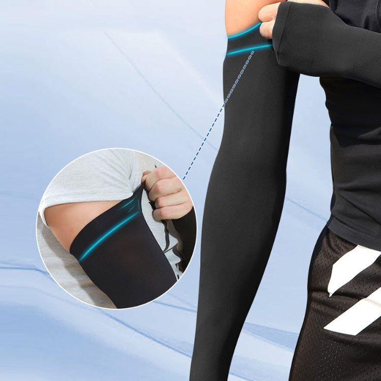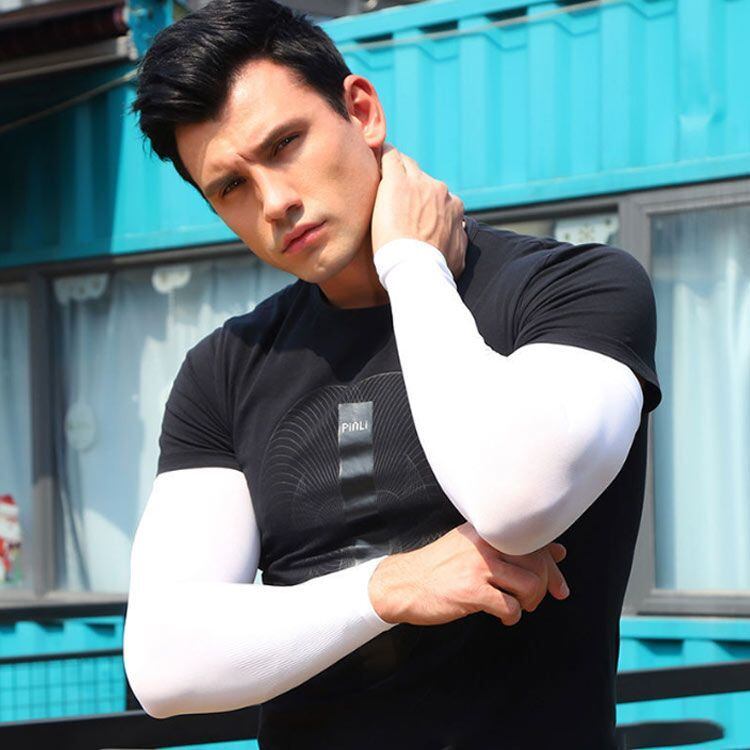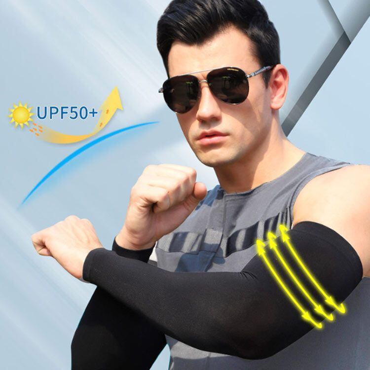 二の腕までしっかりカバーできるロング丈のメンズ用アームカバーです。