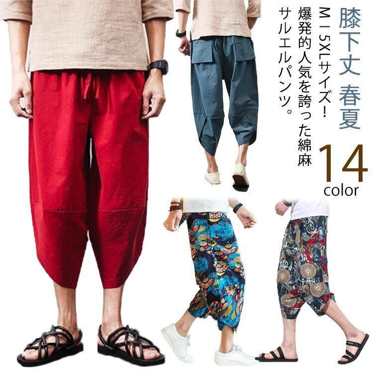 サルエルパンツ 送料無料 メンズ 大きサイズ ワイドパンツ アラジンパンツ リネン パンツ 綿麻 サルエル クロップドパンツ ウエストゴム 無地 総柄 春夏 リラックス 涼しい 薄手#lucky1521 | オキナ商店