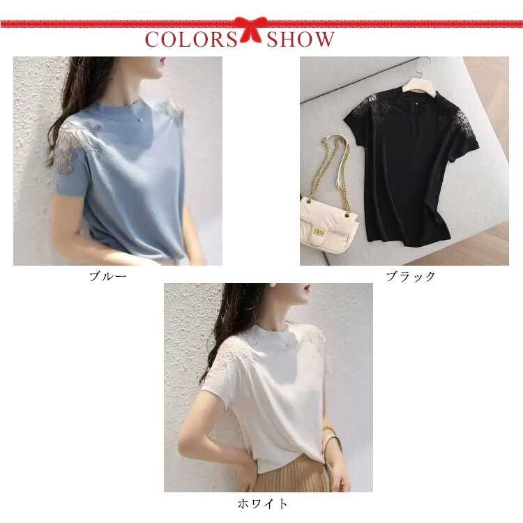 サマーニット レディース 送料無料 ラウンドネック 刺繍 半袖ニット 透け感 トップス 涼しい ひんやり ニットトップス シースルーニット トップス 薄手 きれいめ 30代 40代 50代 ボトルネッ#lucky1412 | オキナ商店