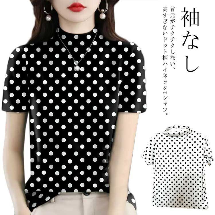 ハイネックトップス tシャツ 送料無料 水玉 袖なし カットソー ハイネック ドット柄トップス ノースリーブ ハイネックtシャツ タイト インナー トップス シンプル ドット柄 春 夏 秋 冬#lucky1410 | オキナ商店