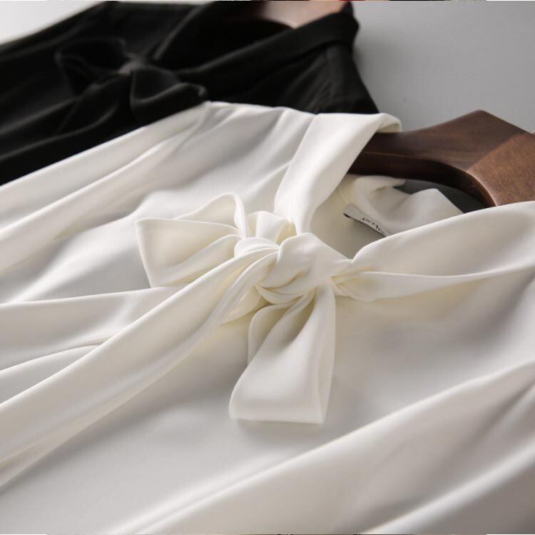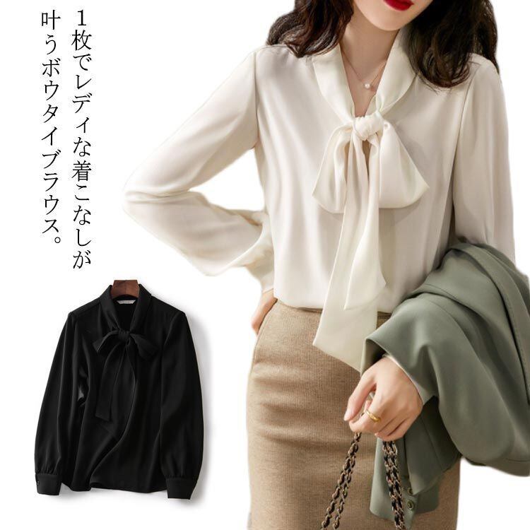 ボウタイ ブラウス レディース トップス 長袖 Vネック 無地 シフォン リボン 秋 冬 春 フェミニン きれいめ オフィスカジュアル ホワイト ブラック 白 黒 フォーマル きれいめ 上品 大人 2#goudoudou4377 | オキナ商店