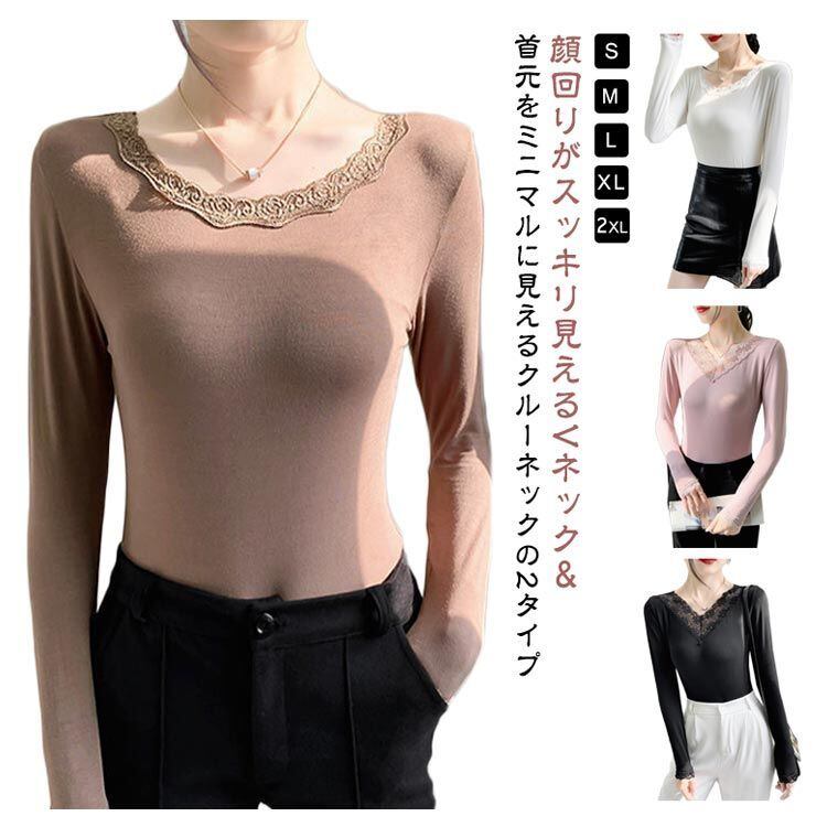 レイヤード レースインナー Vネック ランドネック 保温 肌着 下着 オールシーズン レーストップス 長袖 インナー レース 下着 クルーネック 重ね着 花柄レース 肌隠し 伸縮 薄手 肌着 カットソ#goudoudou4339 | オキナ商店