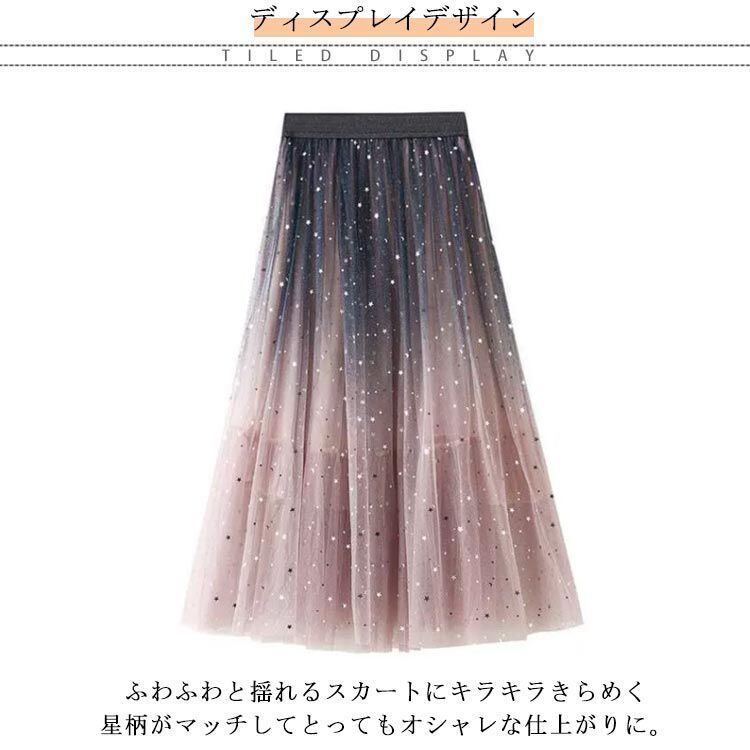チュールスカート 星空 スカート 星柄 レディース フレアスカート チュール ボトムス ミモレ丈 グラデーション ロングスカート 大人 お洒落 体型カバー 裏地あり ウエストゴム 旅行 キレイめ 新年#bon1672 | オキナ商店