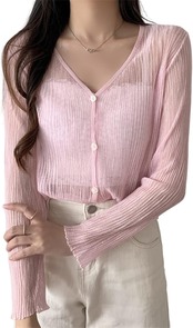 カーディガン 即購入OK レディース 薄手 Vネック シースルー トップス ニット 冷房対策 UVカット 日焼け止め おしゃれ オフィス お出かけ 透け感 肌魅せ ショート丈 前開き きれいめ 上品 春 夏 zhangban207 | オキナ商店