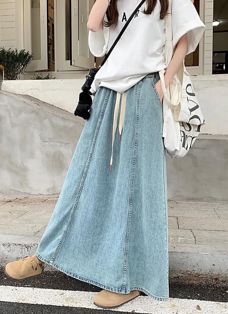 このハイライズのデニムスカートがウエストを引き締め、スタイルアップ効果があります。ウエストゴムと腰ひもの組み合わせで、着脱が簡単で、様々なウエストサイズに対応します。