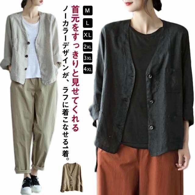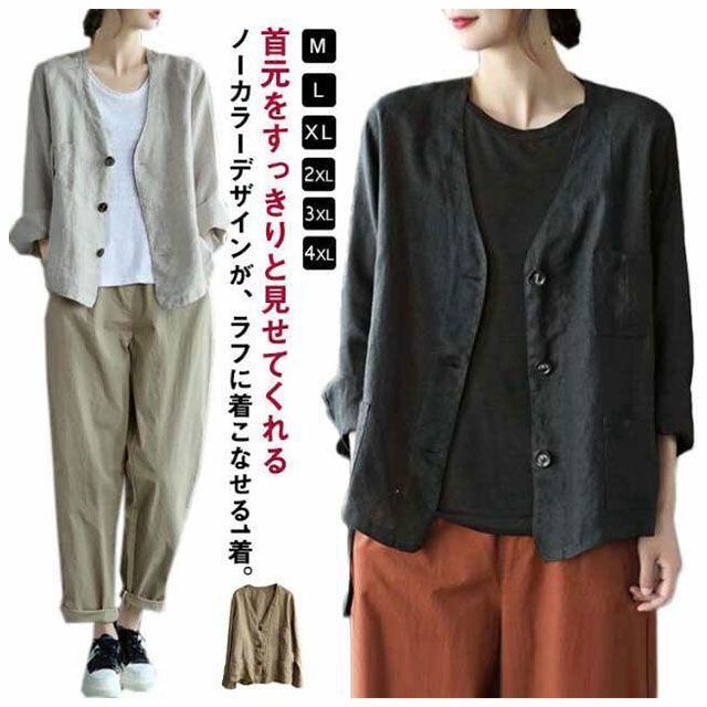 サマージャケット 未使用 ノーカラージャケット 綿麻ジャケット リネンジャケット 襟なし アウター サマー ジャケット ブルゾン ノーカラー 羽織 伸縮性 高見え 着回し 大人 上品 レディース 綿麻 yunban106 | オキナ商店