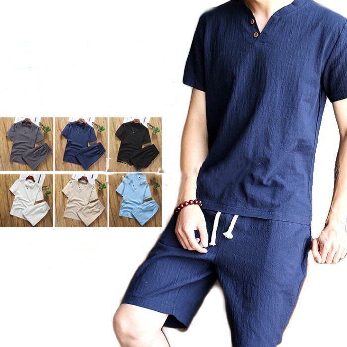 メンズ ルームウェア 即購入OK 綿麻 涼しい通気 夏 無地 セットアップ 部屋着 2点セット リネン素材 五分丈サルエルパンツ ゆったり 半袖Tシャツ*ショートパンツyunban64 | オキナ商店