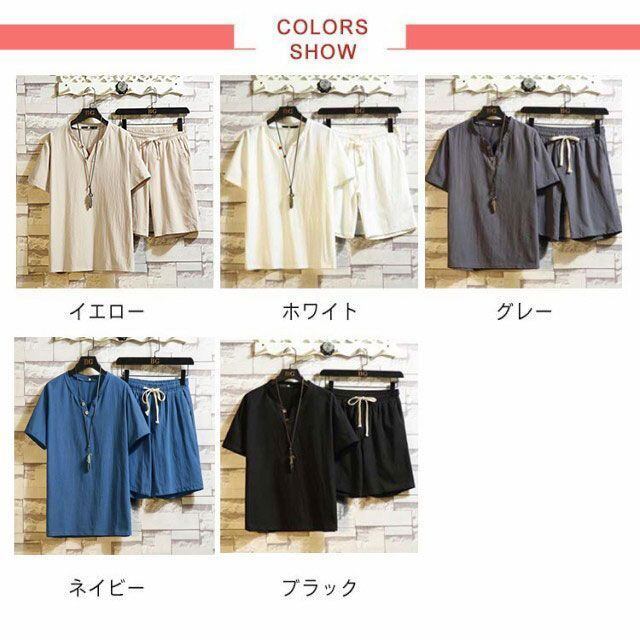メンズ 綿麻 未使用 上下セット tシャツ パンツ 綿 麻 夏用 甚平 パジャマ 部屋着 リネン 半袖 上下 セットアップ ハーフパンツ ショートパンツ トップス ルームウエア ゆったりyunban63 | オキナ商店