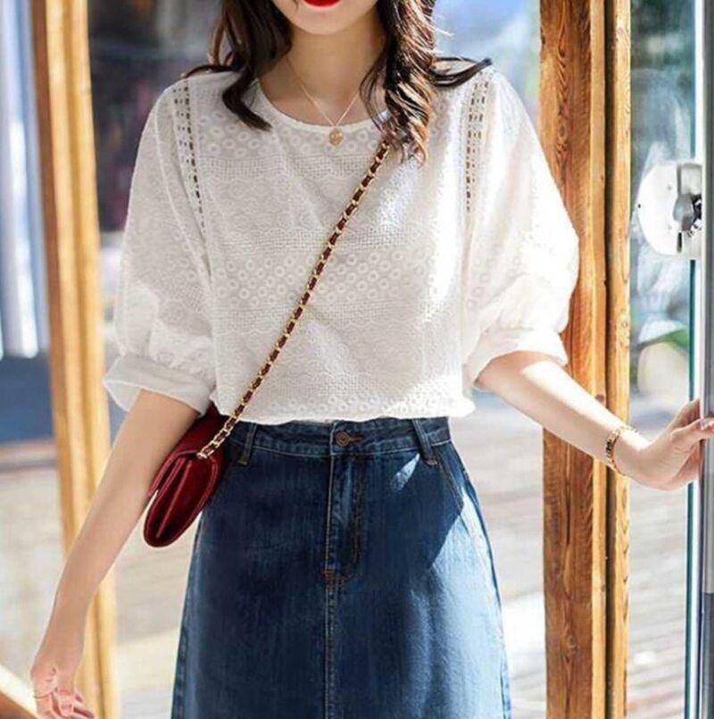 ブラウス レディース 即購入OK 40代 春夏新作 オシャレブラウス 白レースブラウス パフスリーブ Tシャツ 半袖トップス カジュアル 通勤 ゆったりtシャツ 30代 50代 hyxz94 | オキナ商店