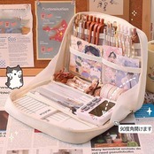 ペン、定規、付箋など必要な文具をまとめて収納でき、そのままデスク上で自立するスタンド型ペンポーチ。
