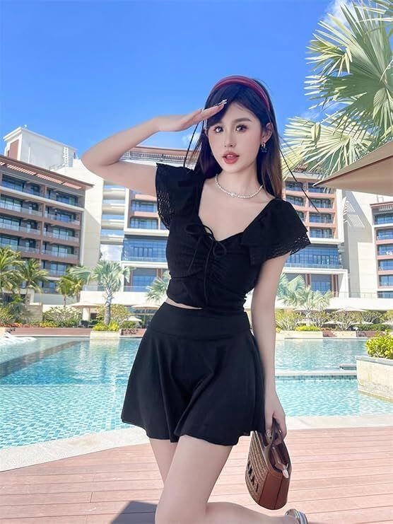 水着セット 即購入OK レディース ビキニ スカート 2点セット セパレート 無地 フリル スイムウェア パッド付き ビスチェ風 体型カバー 速乾 通気 水陸両用 リボン 大人可愛い zhangban86 | オキナ商店