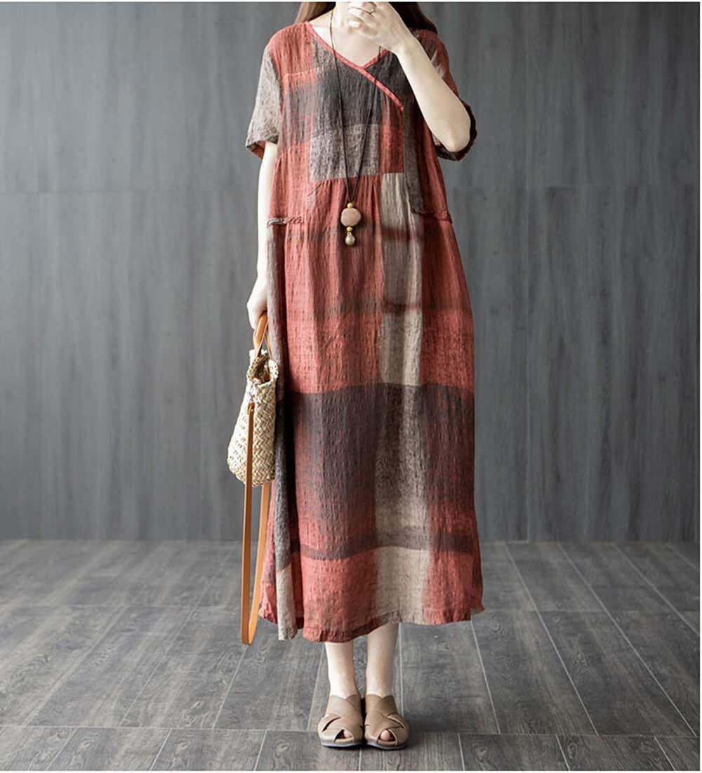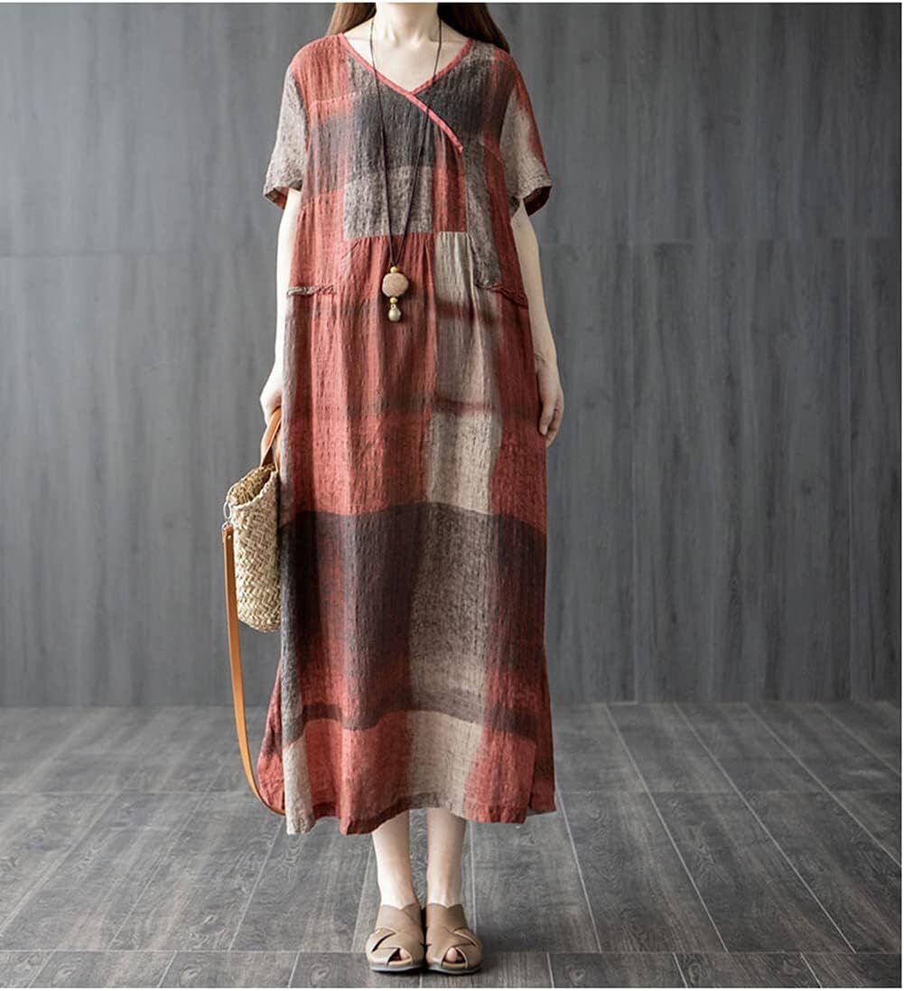 ワンピース 即購入OK レディース ロングワンピース 夏 チェック柄 綿麻 リネンワンピース ロング丈 半袖 Vネック ゆったり マキシワンピース 大きいサイズ 着痩せ ナチュラル zhangban71 | オキナ商店