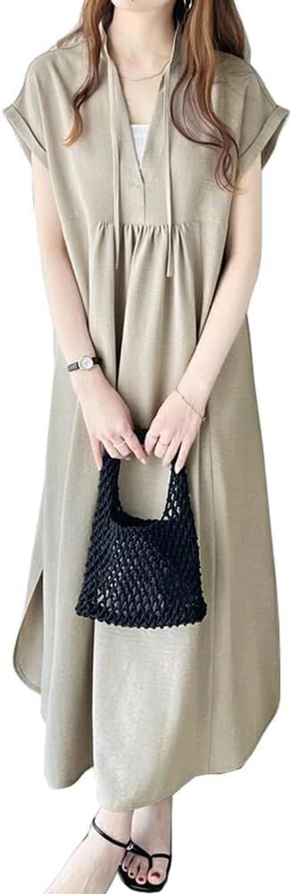 デザイン: シンプルな無地のマキシ丈ワンピースで、ゆったりとしたシルエットが体型カバーを実現