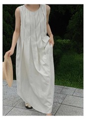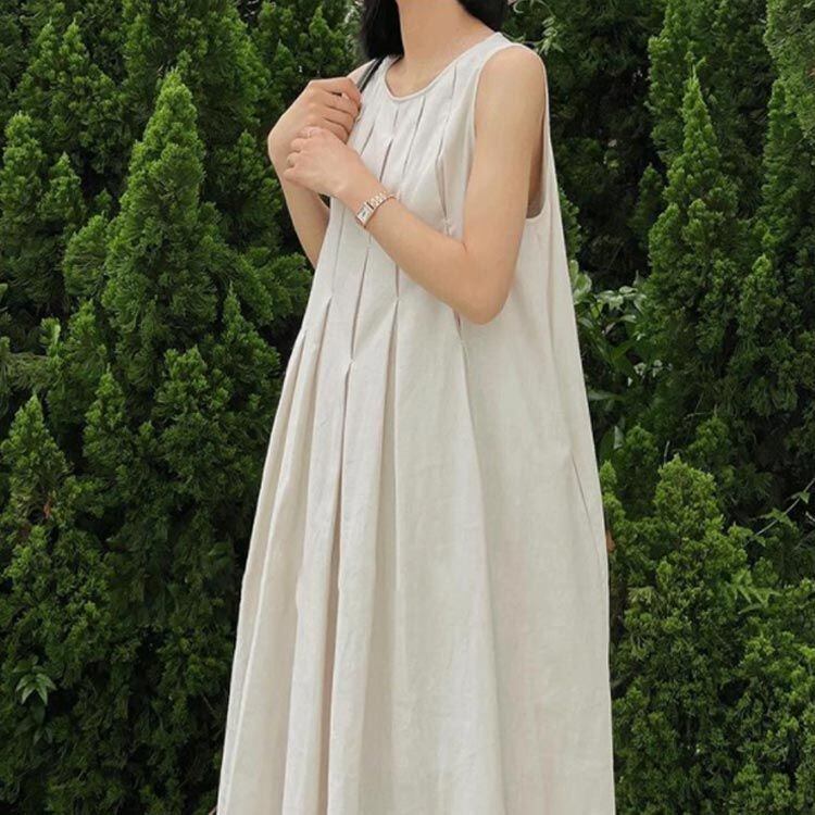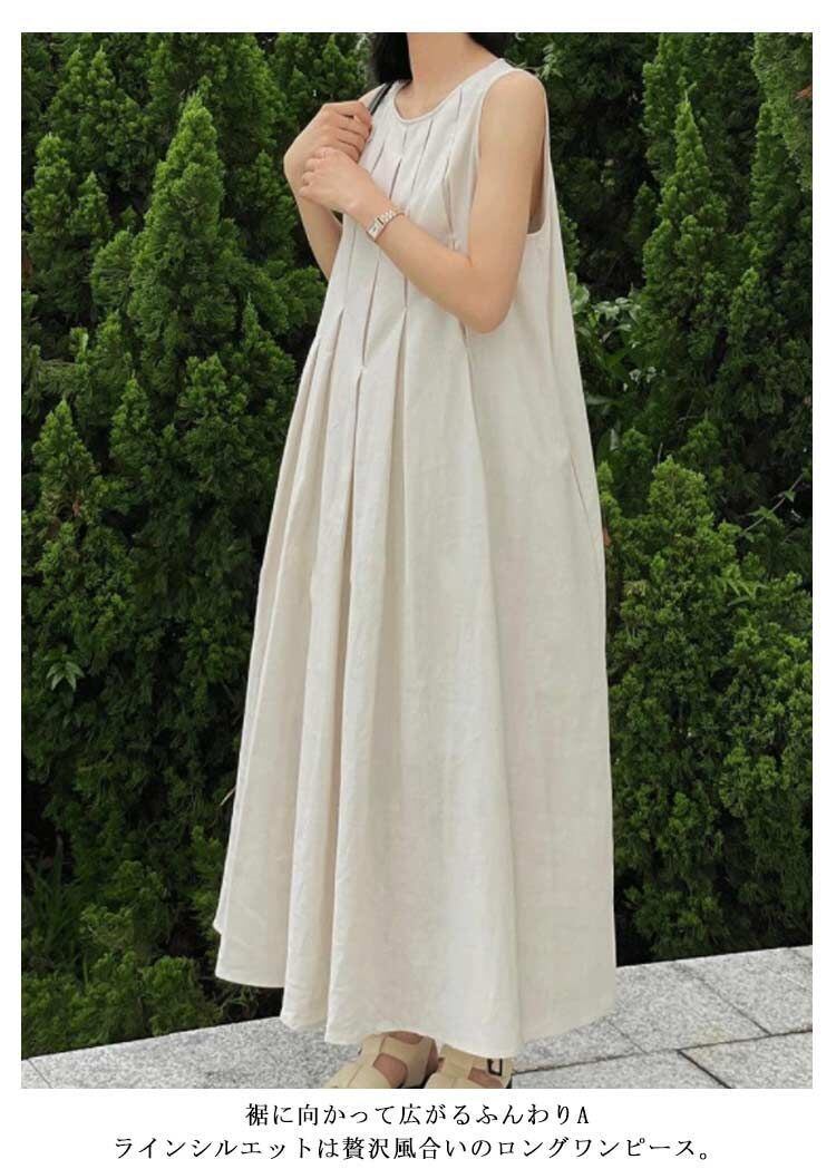 ノースリーブ ロングワンピ 未使用 マキシワンピース 韓国ファッション ワンピ Aライン 春夏 きれいめ ロングワンピース 大きいサイズ レディース ノースリーブタックワンピース 体型カバー 麻風 タンク yunban28 | オキナ商店