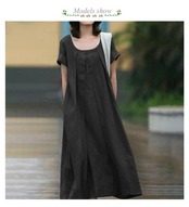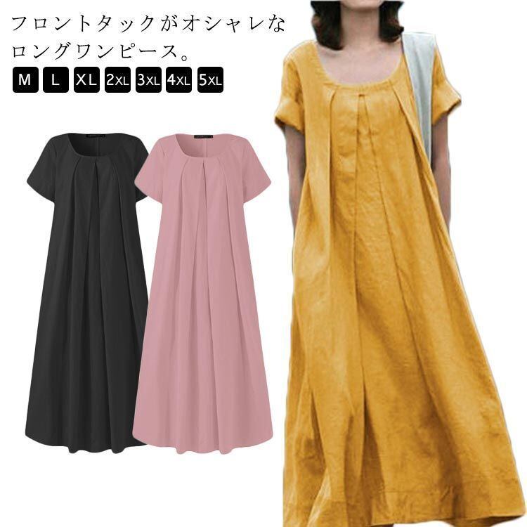 半袖 M-5XL 即購入OK リゾート Aライン マキシワンピース フロントタック リネンワンピース 半袖 体型カバー ワンピース フレアワンピース 無地 春夏 ゆったり おしゃれ カジュアル yunban07 | オキナ商店