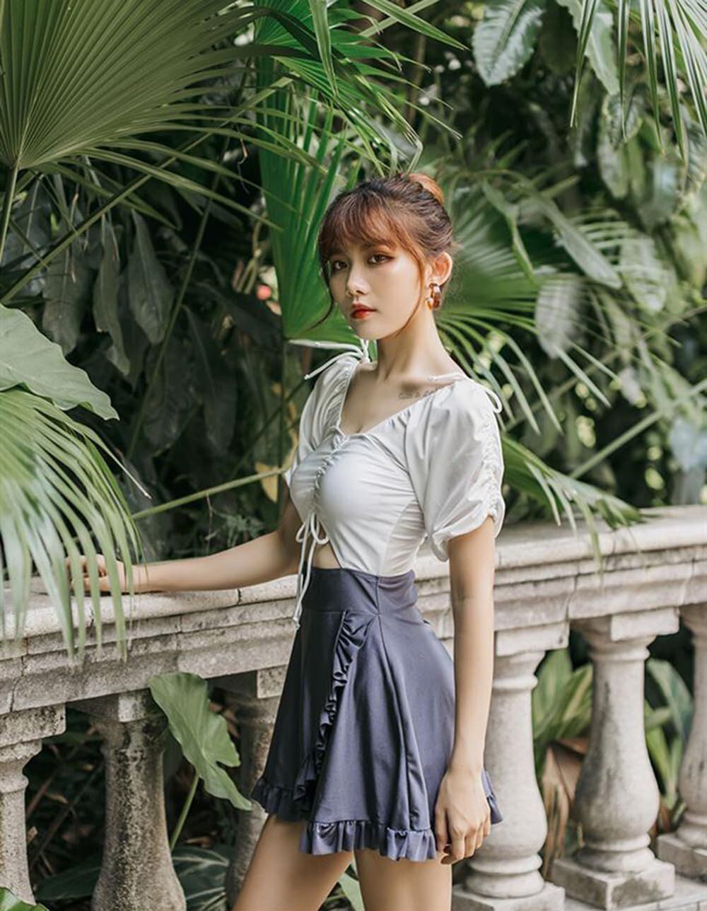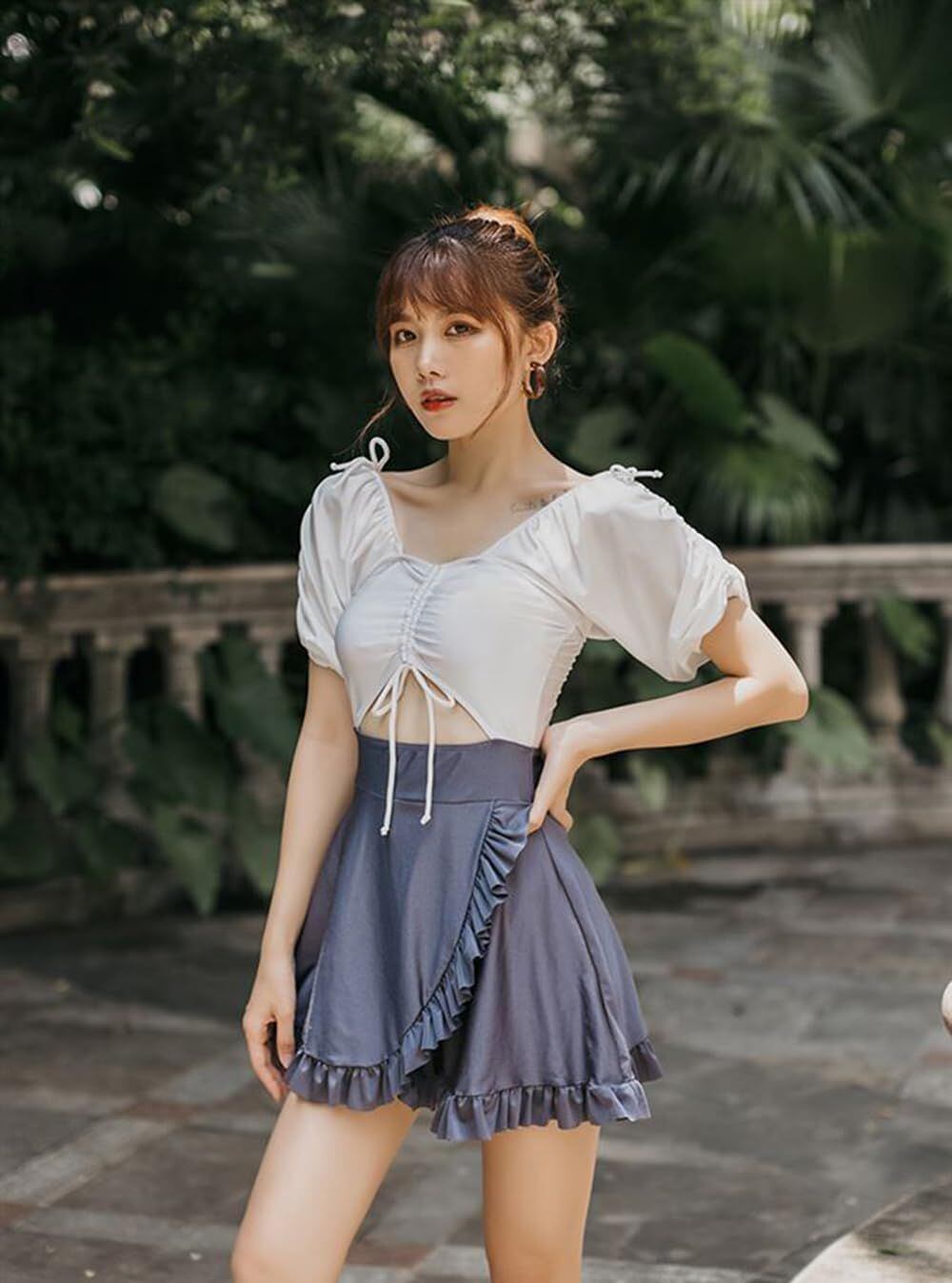 ワンピース水着 未使用 レディース 半袖 フリル バイカラー プリーツ 体型カバー オールインワン 盛れる リボン飾り ハイウエスト オシャレ 可愛い ハイネック パッド付き 速乾 無地 セクシー zhangban99 | オキナ商店