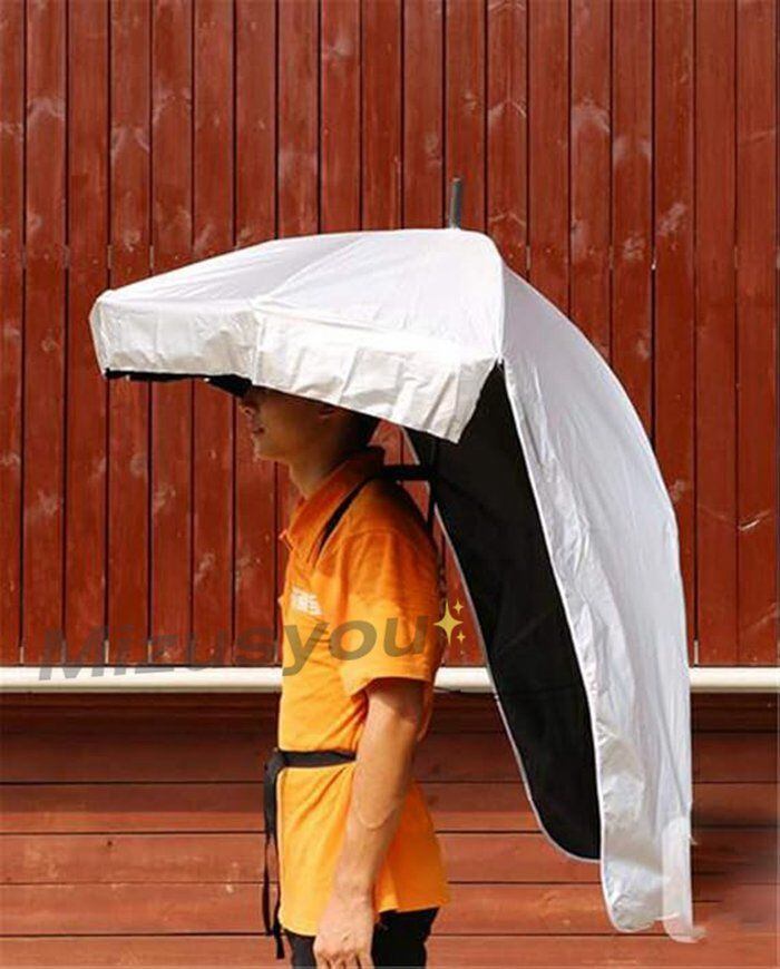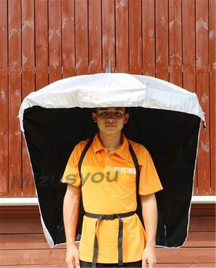 背中に取り付けて使うタイプの農作業かさで、ベルトを締めるだけで簡単に装着可能。両手が解放されるため、作業や釣りなどに非常に便利です。