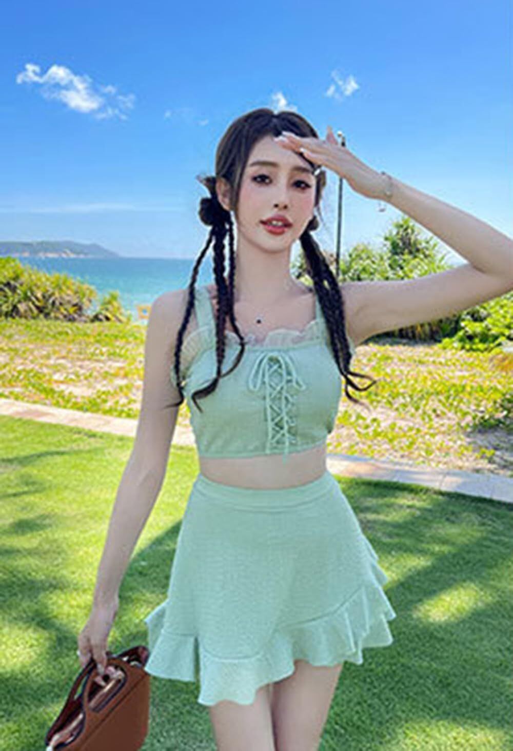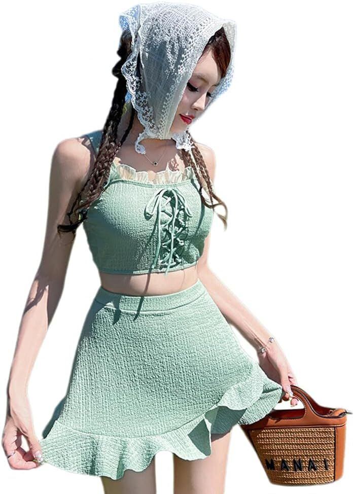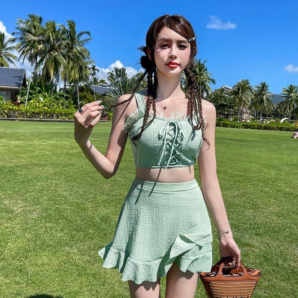 水着セット 即購入OK レディース ビキニ タンキニ 2点 体型カバー ノースリーブ セパレート 無地 スイムウェア ビスチェ風 バスト盛れる ハイウエスト フレア かわいい フリル スカート zhangban82 | オキナ商店