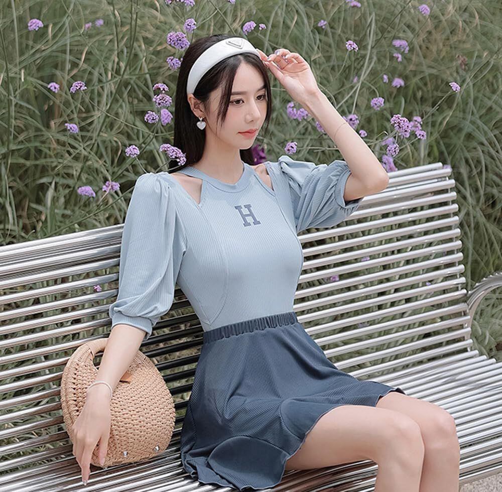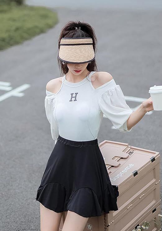 モノキニ 水着 未使用 スカート 2点セット レディース 五分袖 オフショルダー バイカラー 上下セット セパレート 無地 ラウンドネック パッド付き ウエストゴム ランタンスリーブ 露出控えめ zhangban100 | オキナ商店