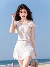 水着セット 未使用 タンキニ スカート 2点セット レディース 上下セット 無地 花柄 半袖 裏地付き 通気 パッド付き スイムウェア 露出控えめ バスト盛れる セパレート フレアスリーブ 可愛い シンプル zhangban96 | オキナ商店