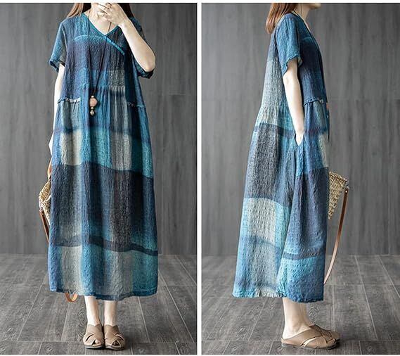 ワンピース 即購入OK レディース ロングワンピース 夏 チェック柄 綿麻 リネンワンピース ロング丈 半袖 Vネック ゆったり マキシワンピース 大きいサイズ 着痩せ ナチュラル zhangban71 | オキナ商店