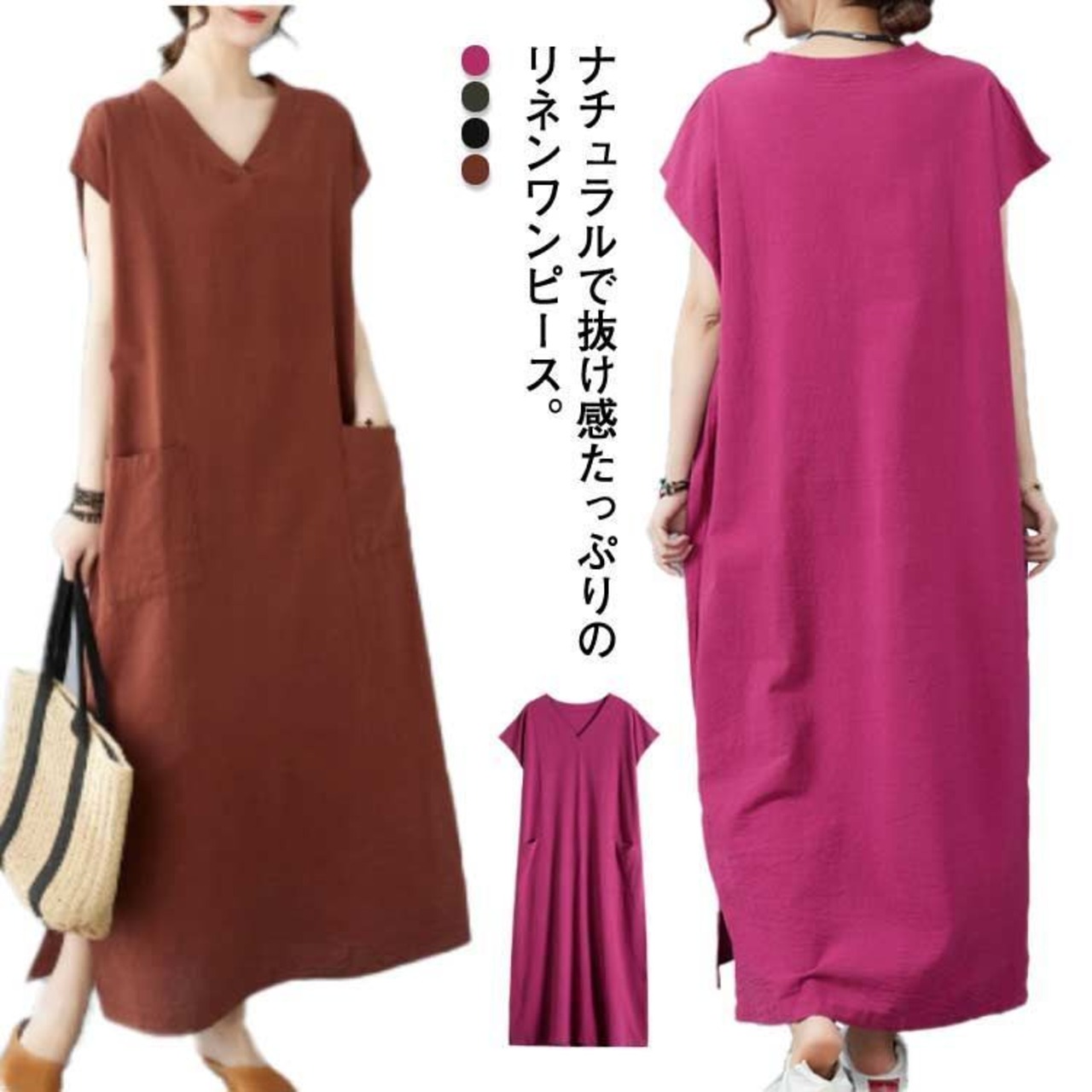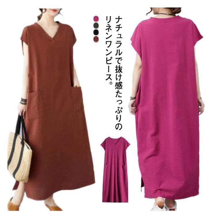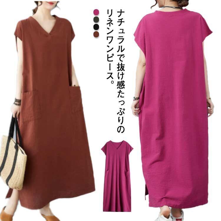 ロングワンピース 未使用 リネンワンピース 大きいサイズ コットンリネン 涼しい 新作 ワンピース 半袖 フレンチスリーブ Vネック ロングワンピース 夏服 ポケット付き スリット入り ゆったり 体型カバー yunban55 | オキナ商店